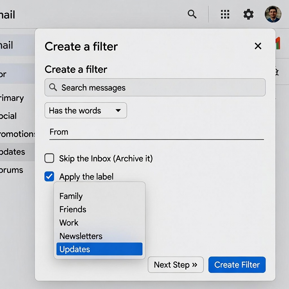 Skip the Inbox (Archive it)Apply the label:(Choose “Newsletters” or create a new one)- Click “Create filter” Now, future emails from that sender will go straight to your “Newsletters” folder, out of your inbox but available if you want to read them.