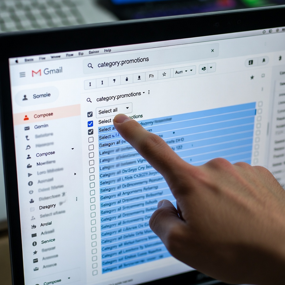 category:promotionsand hit enter. You’ll see all your promotional emails. Click the tiny checkbox at the very top of the list (above the first email) to select all 10,000+ conversations. A blue bar will appear saying “All 10,000 conversations on this page are selected.” Now, click “Select all conversations that match this search.” Boom. You’ve selected every single promo email.