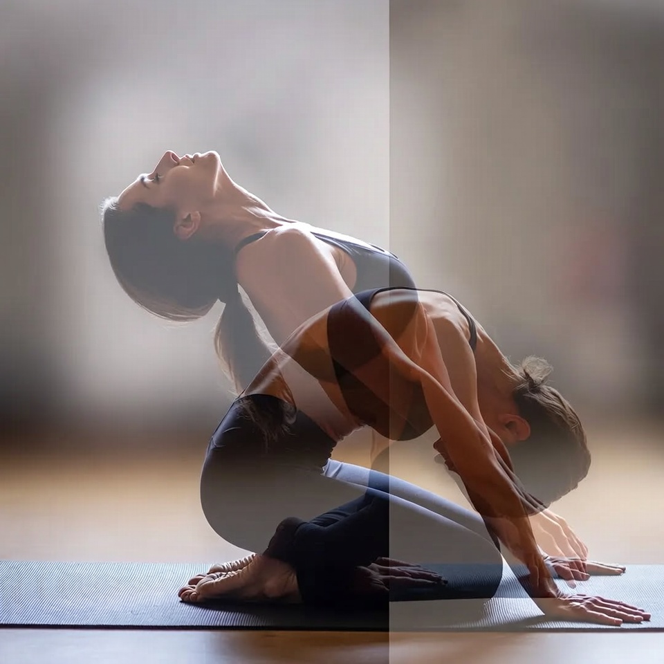 Osoba na czworakach na macie do jogi, uchwycona w stylu podwójnej ekspozycji. Jedna połowa przedstawia wygięte plecy w pozie "Krowa", a druga zaokrąglone plecy w pozie "Kot".