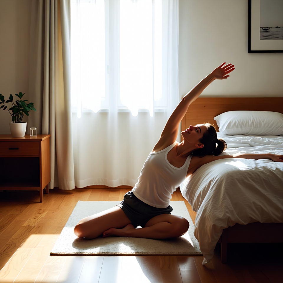 Spokojna, oświetlona słońcem sypialnia. Osoba delikatnie rozciąga się na dywanie obok łóżka, a przez okno wpada światło wczesnego poranka