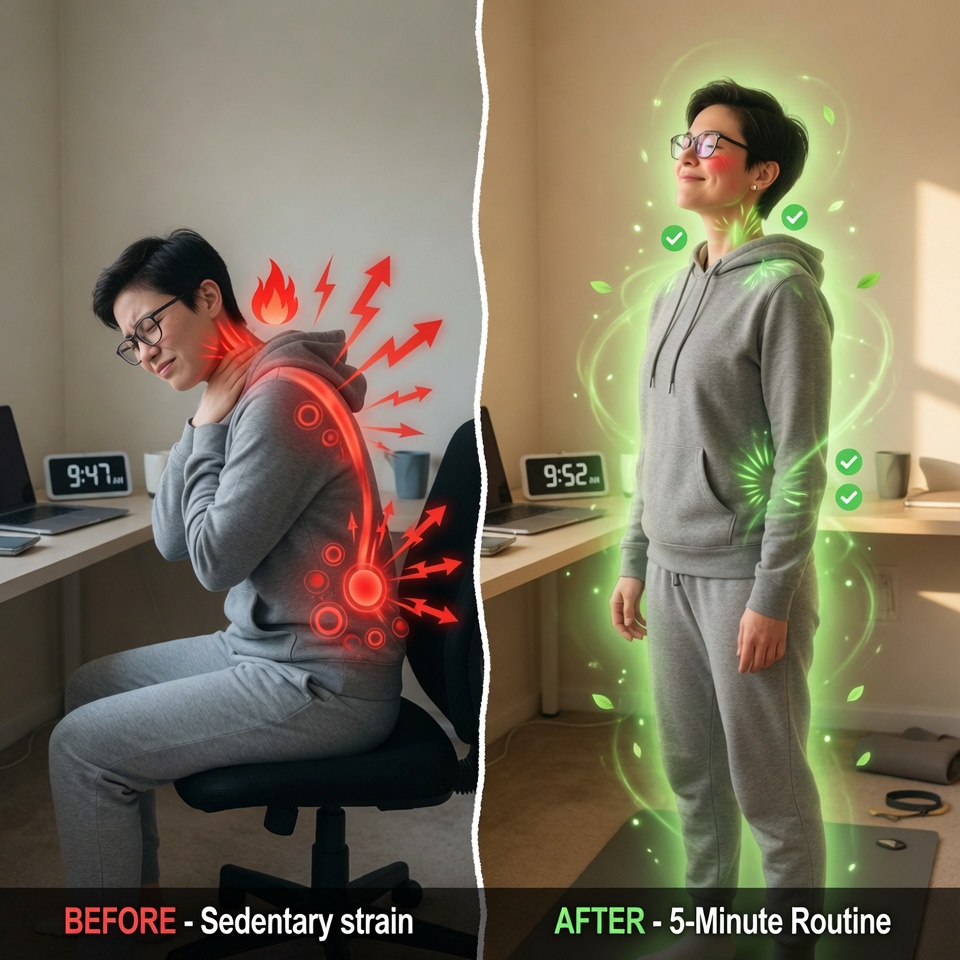 Pesquisas mostram que interromper o tempo sentado com um ou dois minutos de movimento melhora significativamente a saúde metabólica, reduz a dor nas costas e aumenta o desempenho cognitivo. Cinco minutos criam um lanche de movimento que redefine seus músculos posturais, lubrifica as articulações e restaura o fluxo sanguíneo para as áreas comprimidas. Não se trata de fazer exercícios, mas de desfazer o dano antes que ele se agrave.
