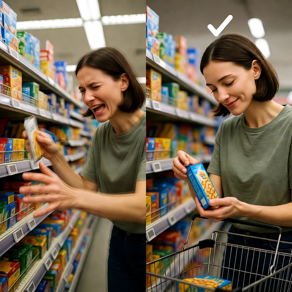 On the left, a person impulsively grabbing a product off a shelf, looking stressed. On the right, the same person the next day, calmly and happily purchasing the same item